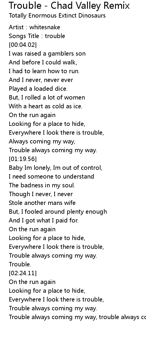 | [03:41.98] | Trouble always coming my way, trouble always coming... |