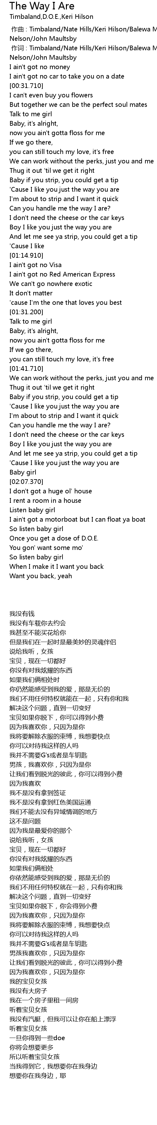 | [00:01.00] | 作词 : Timbaland/Nate Hills/Keri Hilson/Balewa Muhammad/Candice Nelson/John Maultsby |