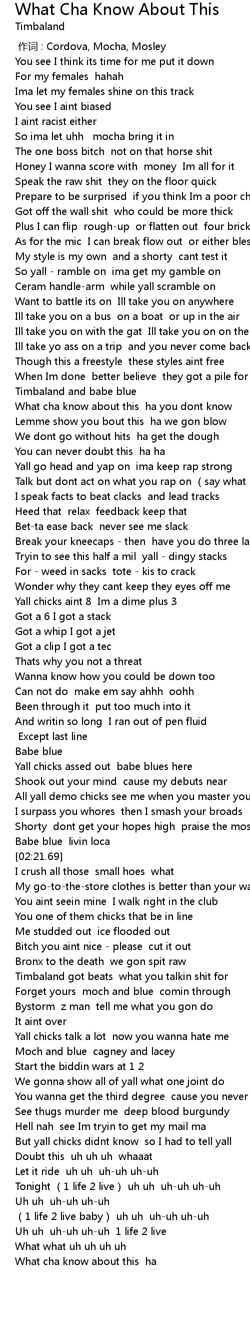 | [02:44.17] | Timbaland got beats what you talkin shit for |