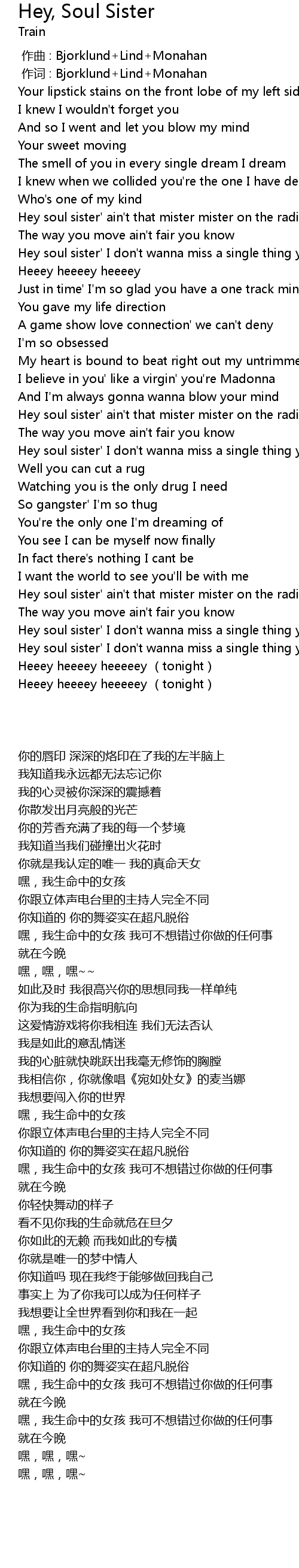 | [03:00.880] | Hey soul sister' I don' t wanna miss a single thing you do tonight |