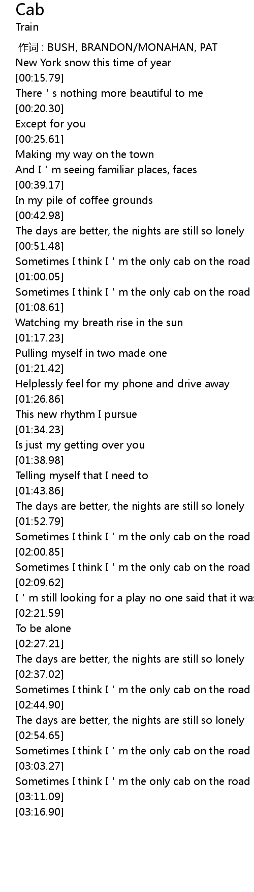 | [01:03.61] | Sometimes I think I'm the only cab on the road |