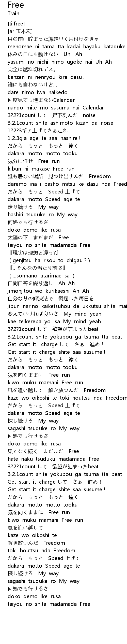 | [02:13.517] | kaze wo oikoshi te toki houttsu nda Freedom |