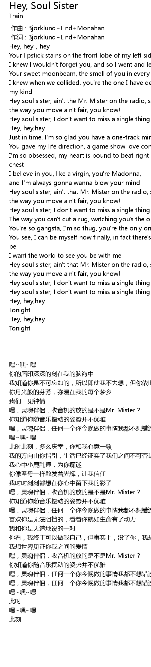 | [00:51.710] | Hey soul sister, ain' t the Mr. Mister on the radio, stereo, |