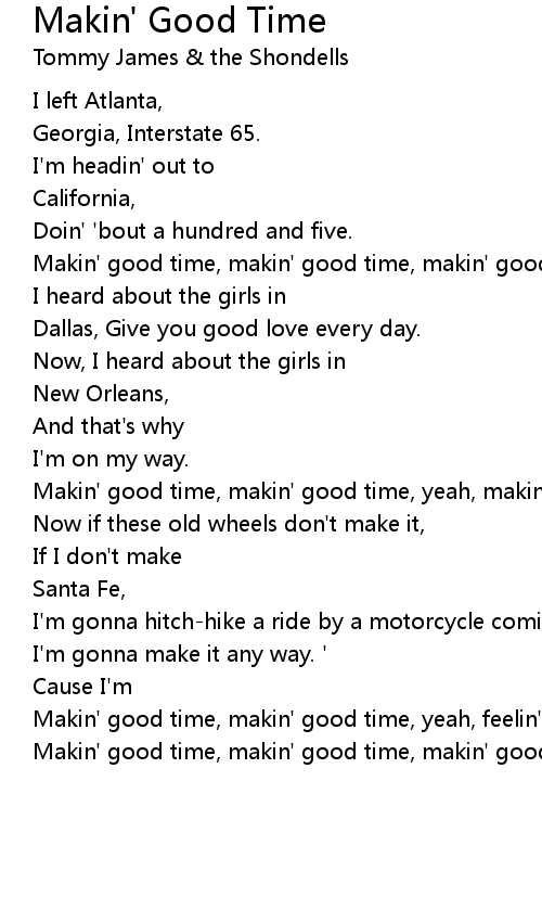 Makin' good time, makin' good time, yeah, feelin' so fine. |