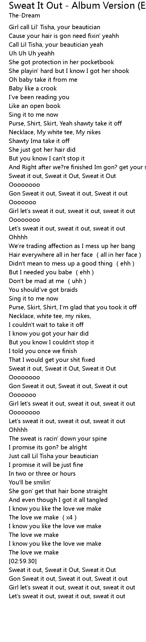 | [02:09.28] | Girl let's sweat it out, sweat it out, sweat it out |