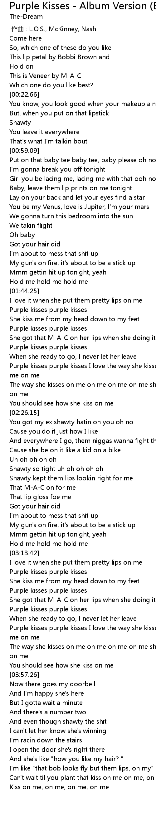 | [02:10.63] | Purple kisses purple kisses I love the way she kisses on me on me on me on me |