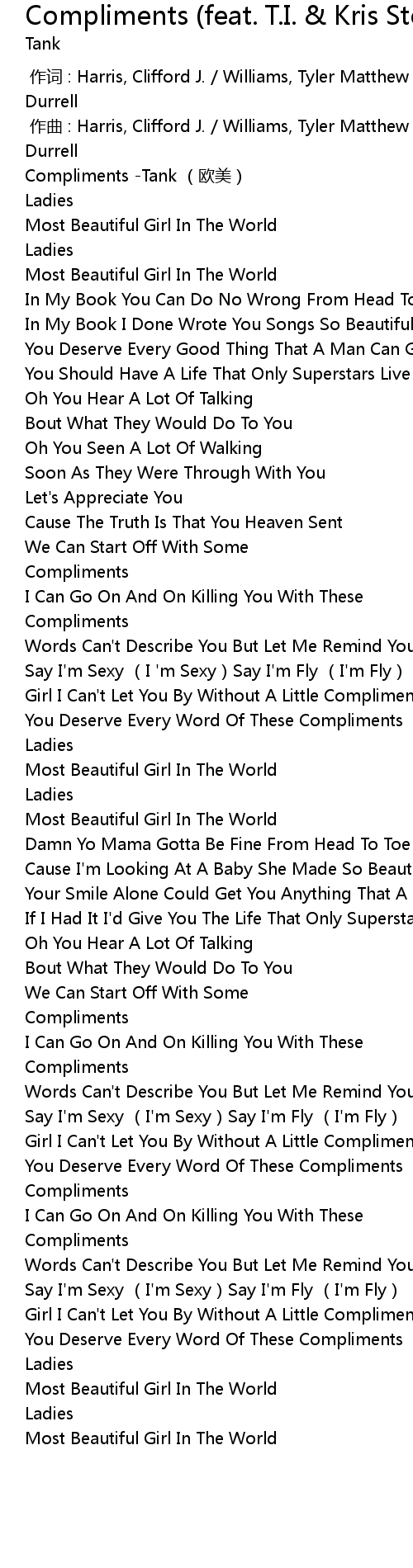| [00:00.230] | Compliments -Tank (欧美) |