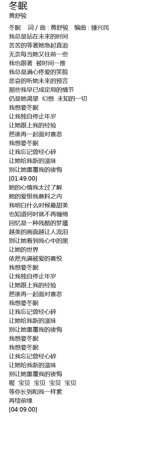 | [00:00.00] | 冬眠 词/曲∶黄舒骏 编曲∶锺兴民 |