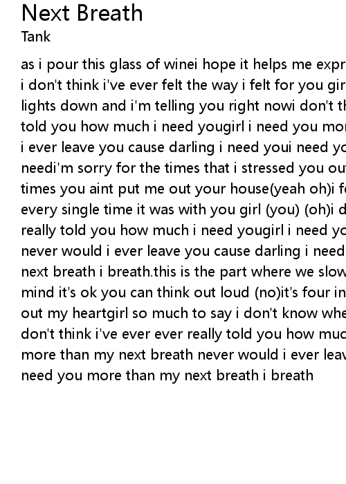as i pour this glass of winei hope it helps me express these thoughts of mineno, i don't think i've ever felt the way i felt for you girlso i'm turning these lights down and i'm telling you right nowi don't think i've ever ever really told you how much i need yougirl i need you more than my next breathnever would i ever leave you cause darling i need youi need you more than my next breath.i needi'm sorry for the times that i stressed you outand i'm thankful for the times you aint put me out your house(yeah oh)i fell in love more than once but every single time it was with you girl (you) (oh)i don't think i've ever ever really told you how much i need yougirl i need you more than my next breath never would i ever leave you cause darling i need youi need you more than my next breath i breath.this is the part where we slow it downmake love to your mind it's ok you can think out loud (no)it's four in the morning and i'm pouring out my heartgirl so much to say i don't know where to start girl oh(oh yeah)i don't think i've ever ever really told you how much i need you girli need you more than my next breath never would i ever leave you cause darling i need youi need you more than my next breath i breath |