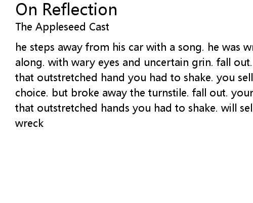 | he steps away from his car with a song. he was wrong. he should have known all along. with wary eyes and uncertain grin. fall out. i saved your voice. trouble. that outstretched hand you had to shake. you sell out. you could have had your choice. but broke away the turnstile. fall out. your friends are toys. in time. that outstretched hands you had to shake. will sell you out. and leave your wreck |