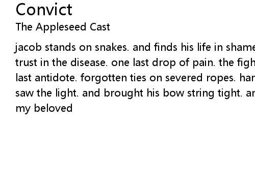 | jacob stands on snakes. and finds his life in shame. they will make their plea. trust in the disease. one last drop of pain. the fighting's all in vain. one last antidote. forgotten ties on severed ropes. hanging them from poles. someone saw the light. and brought his bow string tight. and aimed it at the heart. of my beloved |