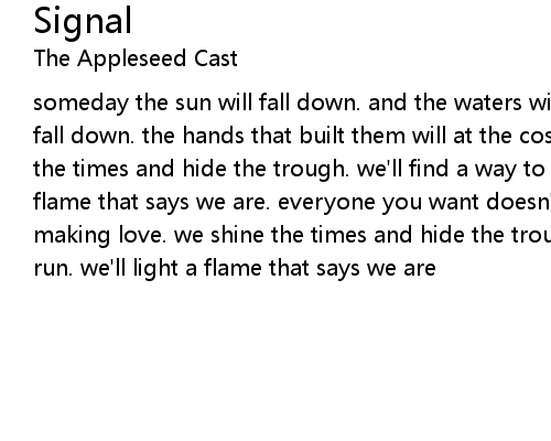 | someday the sun will fall down. and the waters will rise. and the walls will fall down. the hands that built them will at the cost of making love. we shine the times and hide the trough. we'll find a way to make it run. we'll light a flame that says we are. everyone you want doesn't want you back. at the cost of making love. we shine the times and hide the trough. we'll find a way to make it run. we'll light a flame that says we are |