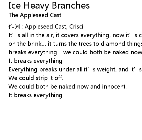 | It' s all in the air, it covers everything, now it' s coming down, now it' s on the brink it turns the trees to diamond things, but it weighs too much, breaks everything we could both be naked now and innocent. | |