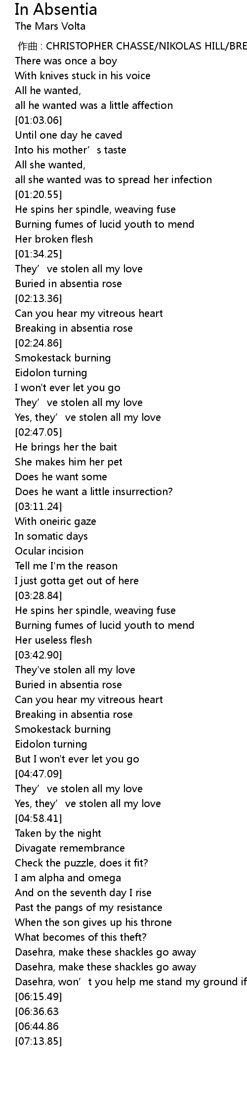 | [03:33.43] | Burning fumes of lucid youth to mend |