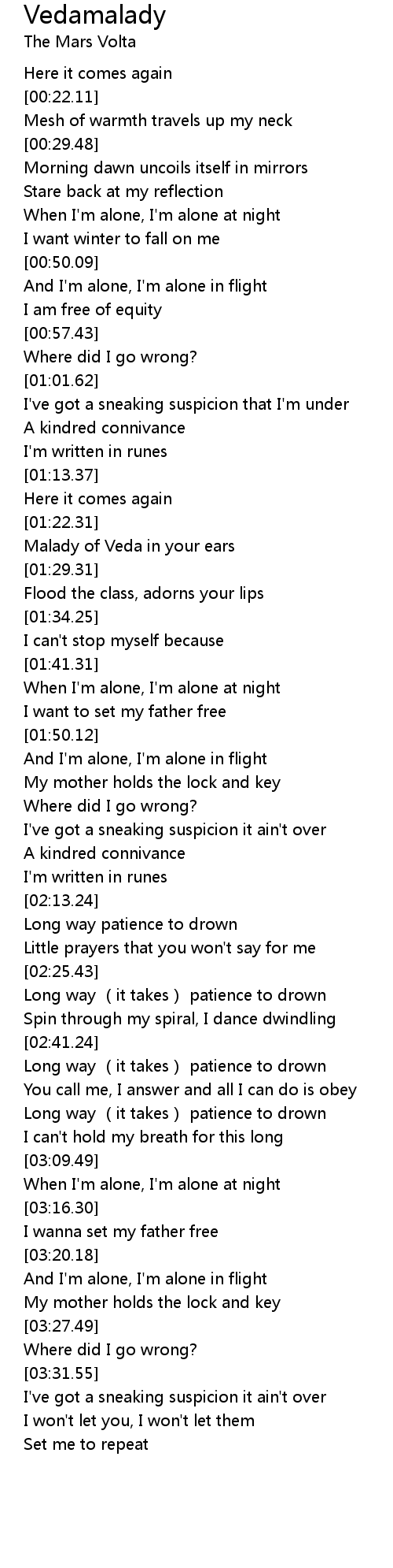 | [01:23.55] | Malady of Veda in your ears |