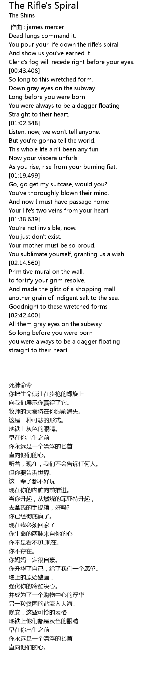 | [00:30.400] | You pour your life down the rifle' s spiral |