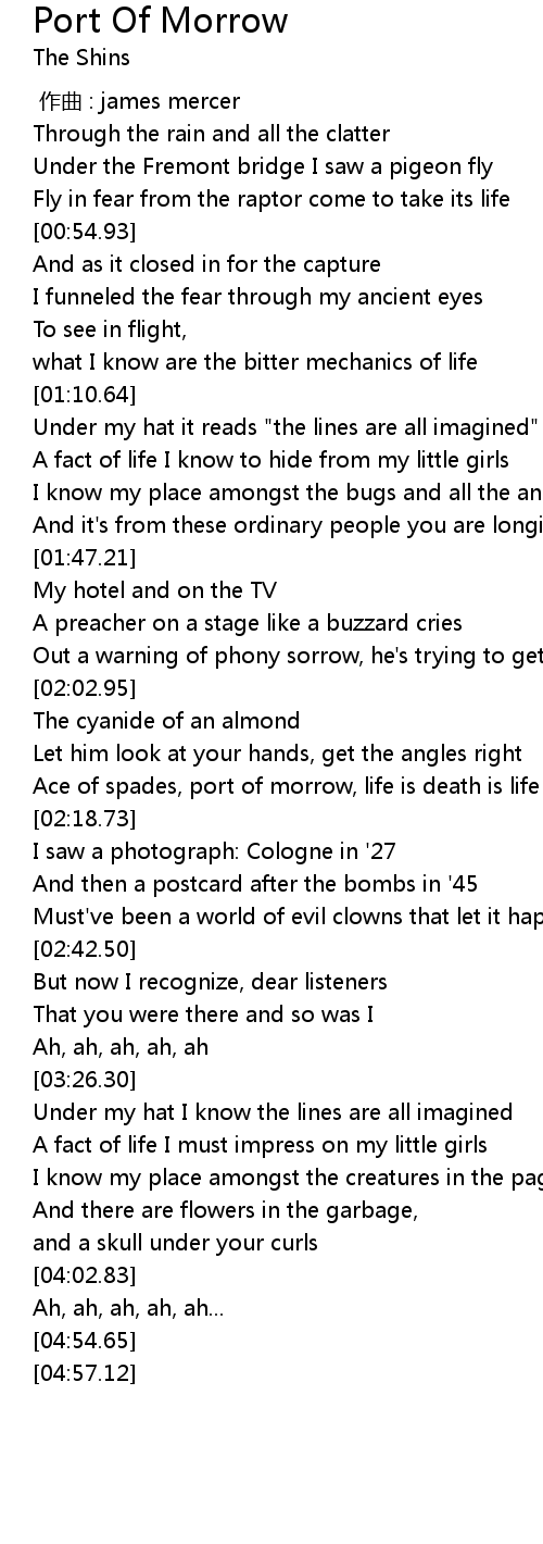 | [00:44.53] | Under the Fremont bridge I saw a pigeon fly |