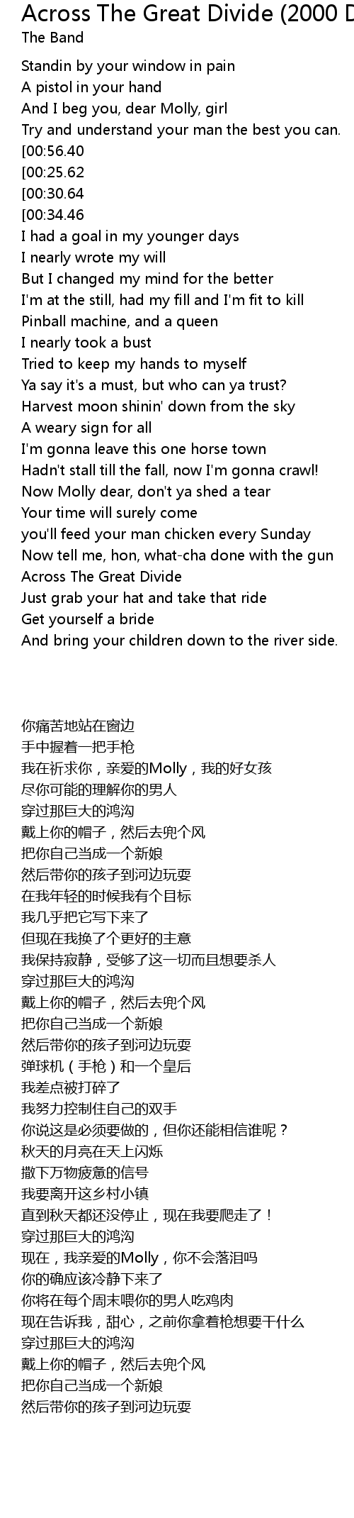 | [01:48.44][00:56.40][00:23.15] | Across The Great Divide, |