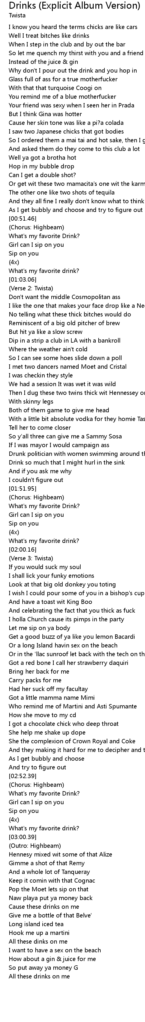| [00:13.71] | Well I treat bitches like drinks |