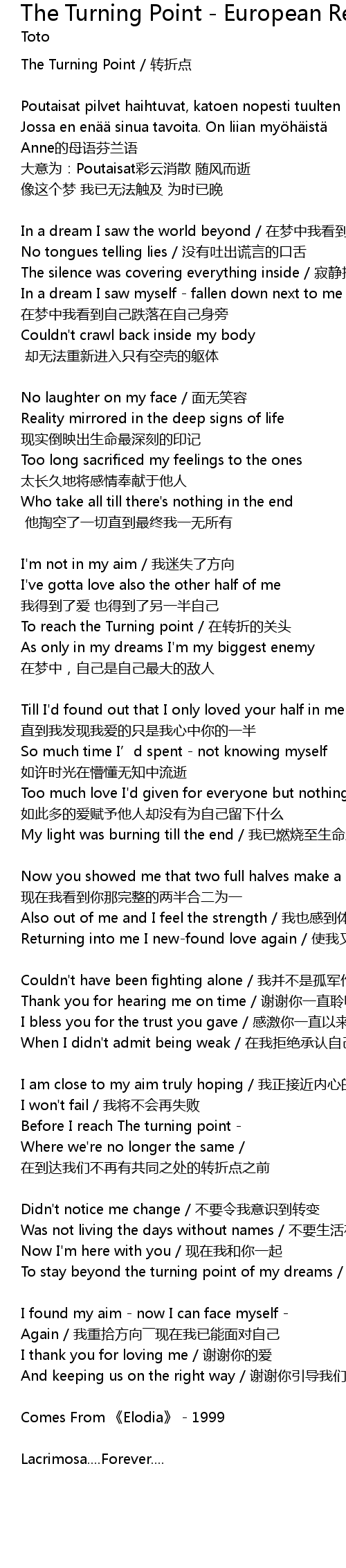 | To stay beyond the turning point of my dreams tíng liú zài mèng xiǎng de zhuǎn zhé diǎn | |