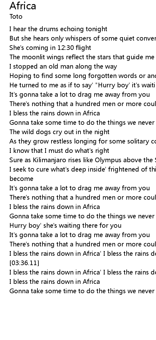 I bless the rains down in Africa' I bless the rains down in Africa |