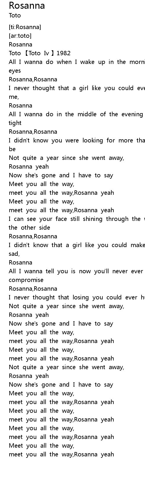 | [04:27.385] | meet you all the way,Rosanna yeah |