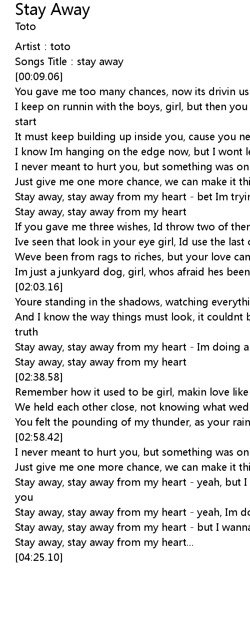 | [04:04.15] | Stay away, stay away from my heart - but I wanna stay away from you |