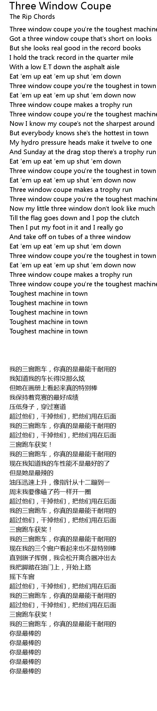 | [00:22.700] | Three window coupe you' re the toughest in town |