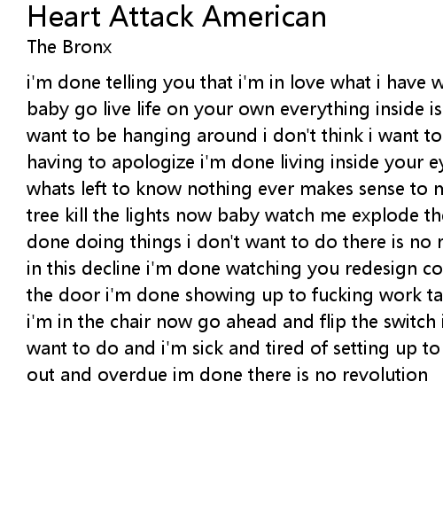 | i'm done telling you that i'm in love what i have will never be enough come on baby go live life on your own everything inside is breaking down and you don't want to be hanging around i don't think i want to leave myself alone i'm done having to apologize i'm done living inside your eyes when the lights go out whats left to know nothing ever makes sense to me a broken branch of the family tree kill the lights now baby watch me explode there is no revolution and i'm done doing things i don't want to do there is no restitution and i'm done living in this decline i'm done watching you redesign come on baby let's go walk out the door i'm done showing up to fucking work taking orders from a fucking bitch i'm in the chair now go ahead and flip the switch i'm done doing things i don't want to do and i'm sick and tired of setting up to be like you fucked up thrown out and overdue im done there is no revolution |