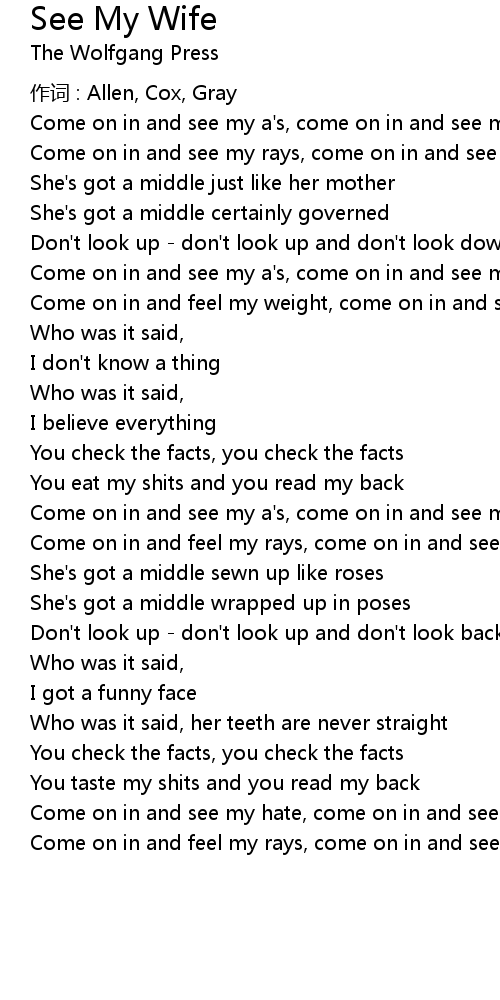 | Come on in and feel my weight, come on in and see my wife, my wife | |