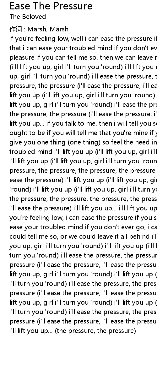 | if you're feeling low, well i can ease the pressure if you should let me know that i can ease your troubled mind if you don't ever go then i can give you pleasure if you can tell me so, then we can leave it all behind i'll lift you up (i'll lift you up, girl i'll turn you 'round) i'll lift you up (i'll lift you up, girl i'll turn you 'round) i'll ease the pressure, the pressure, the pressure, the pressure (i'll ease the pressure, i'll ease the pressure) i'll lift you up (i'll lift you up, girl i'll turn you 'round) i'll lift you up (i'll lift you up, girl i'll turn you 'round) i'll ease the pressure, the pressure, the pressure, the pressure (i'll ease the pressure, i'll ease the pressure) i'll lift you up... if you talk to me, then i will tell you something like how it ought to be if you will tell me that you're mine if you believe in me, i will give you one thing (one thing) so feel the need in me, and i will ease your troubled mind i'll lift you up (i'll lift you up, girl i'll turn you 'round) i'll lift you up (i'll lift you up, girl i'll turn you 'round) i'll ease the pressure, the pressure, the pressure, the pressure (i'll ease the pressure, i'll ease the pressure) i'll lift you up (i'll lift you up, girl i'll turn you 'round) i'll lift you up (i'll lift you up, girl i'll turn you 'round) i'll ease the pressure, the pressure, the pressure, the pressure (i'll ease the pressure, i'll ease the pressure) i'll lift you up... i'll lift you up... (pressure) if you're feeling low, i can ease the pressure if you should let me know that i can ease your troubled mind if you don't ever go, i can give you pleasure if you could tell me so, or we could leave it all behind i'll lift you up (i'll lift you up, girl i'll turn you 'round) i'll lift you up (i'll lift you up, girl i'll turn you 'round) i'll ease the pressure, the pressure, the pressure, the pressure (i'll ease the pressure, i'll ease the pressure) i'll lift you up (i'll lift you up, girl i'll turn you 'round) i'll lift you up (i'll lift you up, girl i'll turn you 'round) i'll ease the pressure, the pressure, the pressure, the pressure (i'll ease the pressure, i'll ease the pressure) i'll lift you up (i'll lift you up, girl i'll turn you 'round) i'll lift you up (i'll lift you up, girl i'll turn you 'round) i'll ease the pressure, the pressure, the pressure, the pressure (i'll ease the pressure, i'll ease the pressure) i'll lift you up... i'll lift you up... (the pressure, the pressure) |