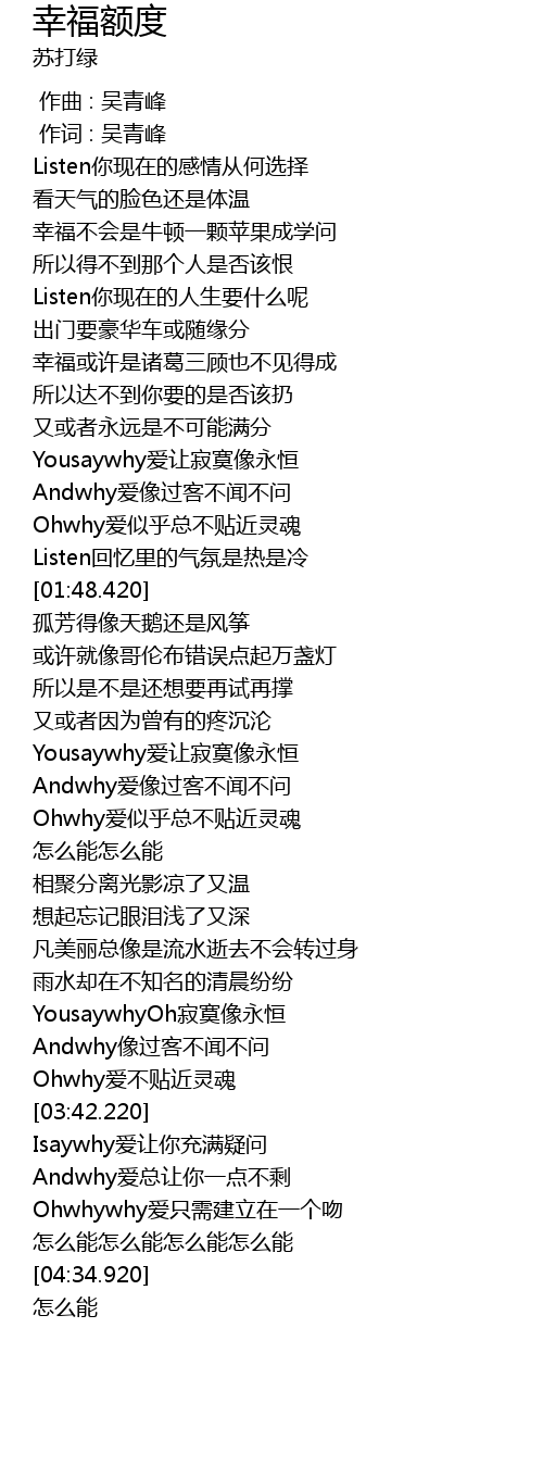| [00:00.00] | 作曲 : 吴青峰 |