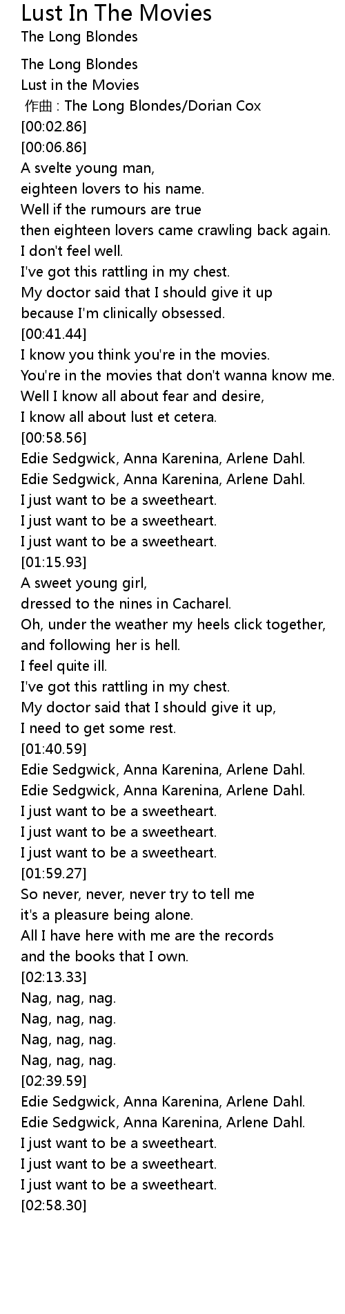 | [02:44.87] | Edie Sedgwick, Anna Karenina, Arlene Dahl. |