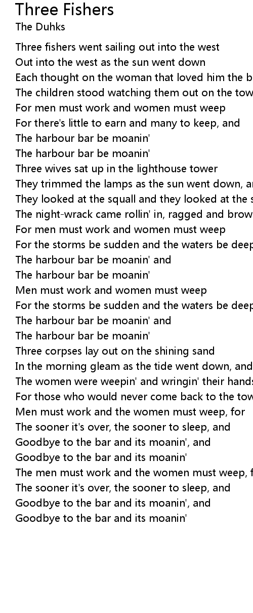 Three fishers went sailing out into the west |