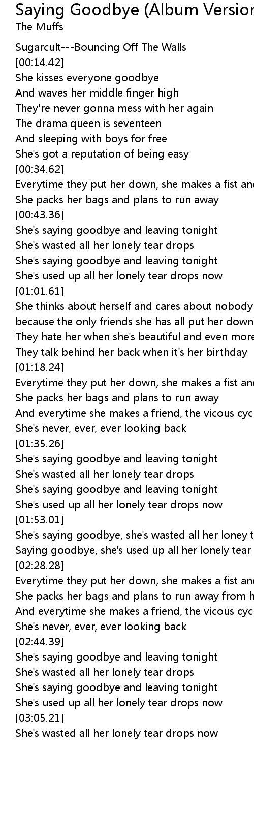 | [02:10.27] | She's saying goodbye, she's wasted all her loney tear drops |