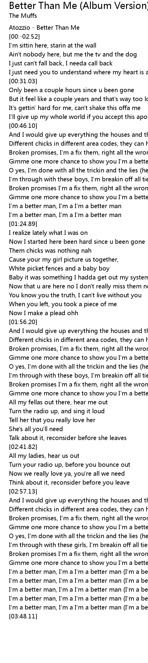 | [00:57.44] | Gimme one more chance to show you I'm a better man (hey hey) |
