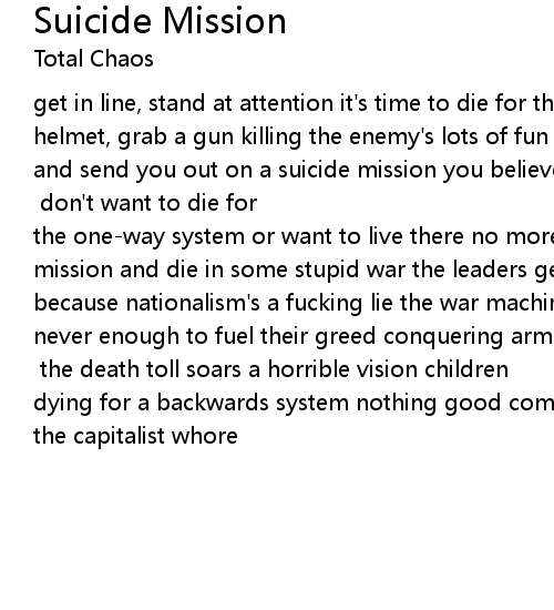 get in line, stand at attention it's time to die for the one-way system here's helmet, grab a gun killing the enemy's lots of fun load you down with patriotism and send you out on a suicide mission you believe the shit they stick in your head it's your own damn fault you wind up dead [Chorus:] don't want to die for the one-way system or want to live there no more don't want to go on a suicide mission and die in some stupid war the leaders get fat while good men die because nationalism's a fucking lie the war machines they think they need are never enough to fuel their greed conquering armies kill the poor it's mankind's fault he invented war [Chorus:] the death toll soars a horrible vision children dying for a backwards system nothing good comes out of war just the profits of the capitalist whore |