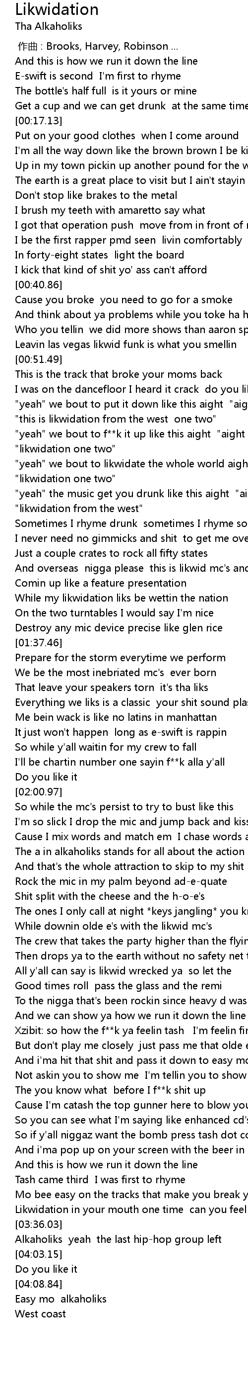 | [01:24.96] | And overseas nigga please this is likwid mc's and they drunk |
