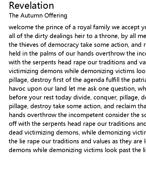 welcome the prince of a royal family we accept your heritage, of carnage, and all of the dirty dealings heir to a throne, by all means, necessary all hail to the thieves of democracy take some action, and reclaim that which at once, we held in the palms of our hands overthrow the incompetent consider the source off with the serpents head rape our traditions and values as they are left for dead victimizing demons while demonizing victims look past the lie divide, conquer, pillage, destroy first of the agenda fulfill the patriarchs revenge and reeking havoc upon our land let me ask one question, whose children did you slaughter before your rest today divide, conquer, pillage, destroy divide, conquer, pillage, destroy take some action, and reclaim that which at once we held in our hands overthrow the incompetent consider the source off with the serpents head off with the serpents head rape our traditions and values as they are left for dead victimizing demons, while demonizing victims look past the lie look past the lie rape our traditions and values as they are left for dead victimizing demons while demonizing victims look past the lie |