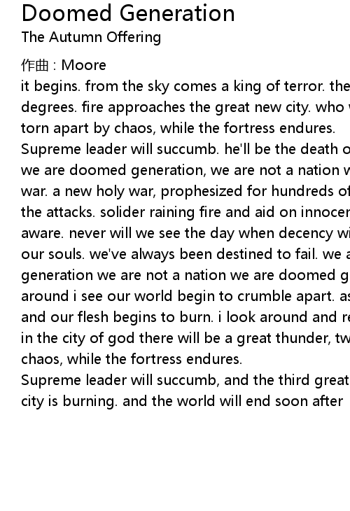 | Supreme leader will succumb. he' ll be the death of us all. we are not a nation, we are doomed generation, we are not a nation we are doomed generation. war. war. a new holy war, prophesized for hundreds of years spawns from the deaths of the attacks. solider raining fire and aid on innocence, if only we could be aware. never will we see the day when decency will prevail. god have mercy on our souls. we' ve always been destined to fail. we are not a nation we are doomed generation we are not a nation we are doomed generation. now. now. as i look around i see our world begin to crumble apart. as poison rains from the skies, and our flesh begins to burn. i look around and realize i have nowhere to turn. in the city of god there will be a great thunder, twin brothers torn apart by chaos, while the fortress endures. | |