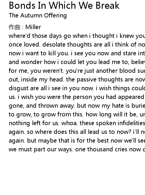 | where' d those days go when i thought i knew you? what happened to the person, i once loved. desolate thoughts are all i think of now. its killing my mind, and now i want to kill you. i see you now and stare into those whore stained eyes and wonder how i could let you lead me to, believe that you were someone good for me, you weren' t. you' re just another blood sucking leech. violence breaks out, inside my head. the passive thoughts are now thrown away. despise and disgust are all i see in you now. i wish things could have been right between us. i wish you were the person you had appeared to be. but now my thoughts are gone, and thrown away. but now my hate is buried inside me, left for new seeds to grow, to grow from this. how long will it be, until you notice, there is nothing left for us. whoa. these spoken infidelities will never see our daylight again. so where does this all lead us to now? i' ll never be able to look at you again. but maybe that is for the best now we' ll see. death is now near my dear, we must part our ways. one thousand cries now die. |