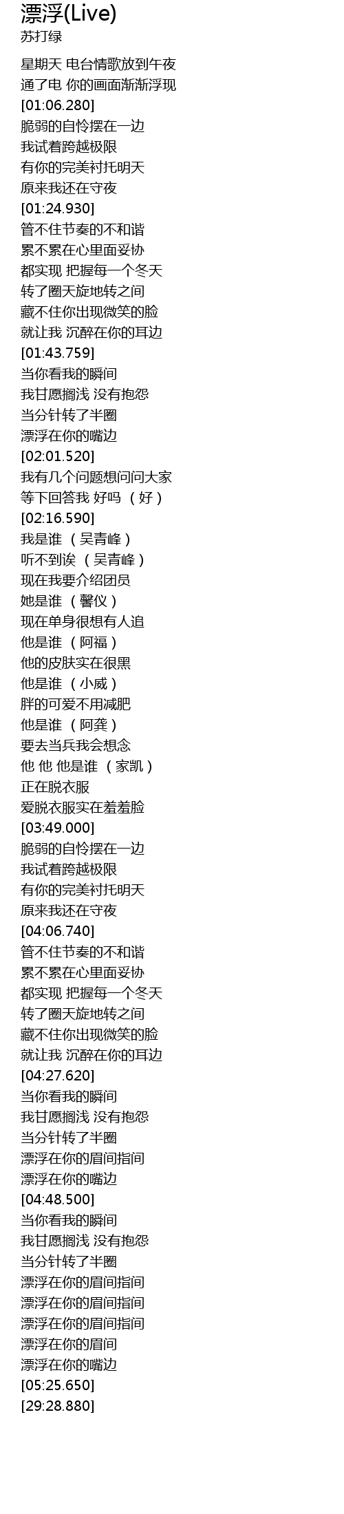 | [05:00.630] | piāo fú zài nǐ de méi jiān zhǐ jiān |