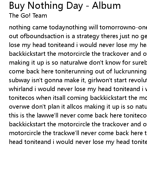 nothing came todaynothing will tomorrowno-one took the system cos the world was out ofboundsaction is a strategy theres just no getting roundbut i would never lose my head toniteand i would never lose my head tonitecos when itsall coming backkickstart the motorcircle the trackover and overwe don't plan it allcos making it up is so naturalwe don't know for surebut this is the lawwe'll never come back here toniterunning out of luckrunning out of moneyrunning for the subway isn't gonna make it, girlwon't start revolutions but we're giving it a whirland i would never lose my head toniteand i would never lose my head tonitecos when itsall coming backkickstart the motorcircle the trackover and overwe don't plan it allcos making it up is so naturalwe don't know for surebut this is the lawwe'll never come back here tonitecos when itsall coming backkickstart the motorcircle the trackover and overall coming backkickstart the motorcircle the trackwe'll never come back here toniteand i would never lose my head toniteand i would never lose my head tonite |