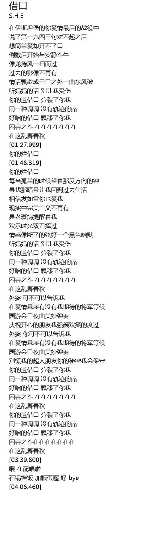 | [04:04.050] | shi guo ban fan jia ke dan o hao bye |