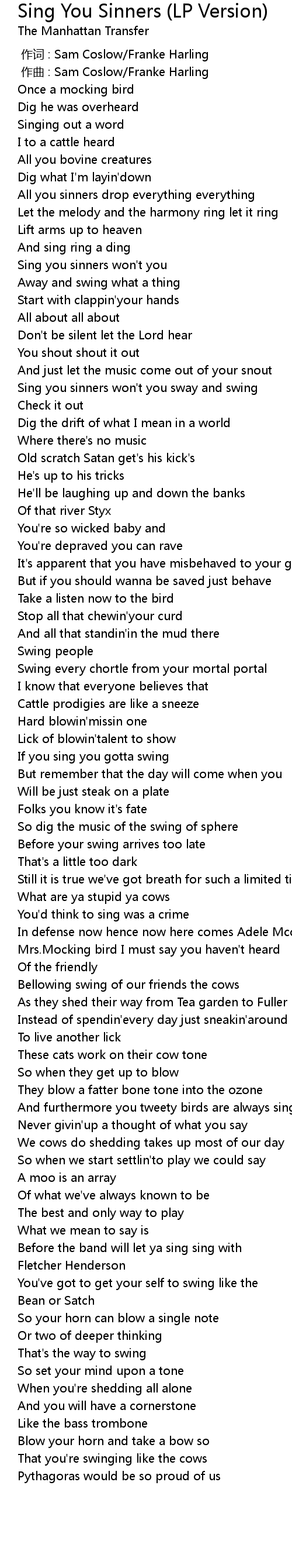 | [00:27.954] | Sing you sinners won' t you sway and swing |