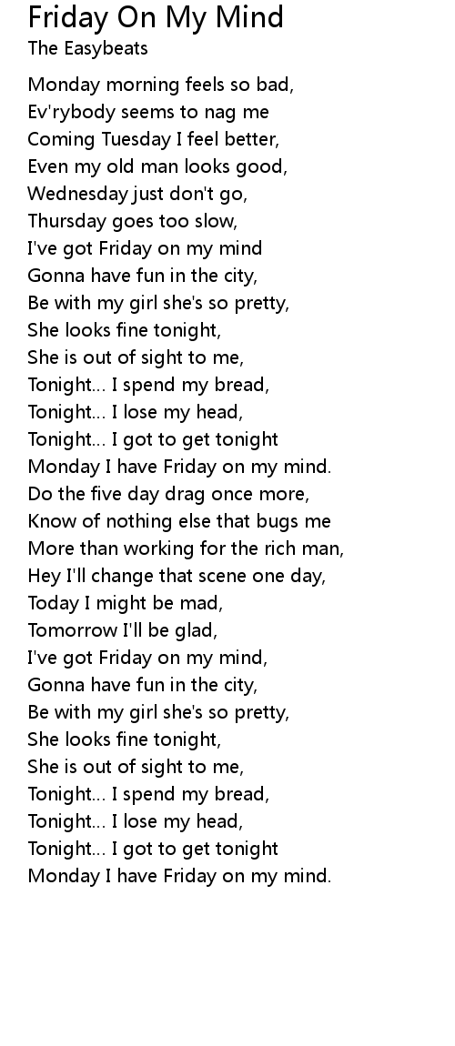 | I've got Friday on my mind, | |