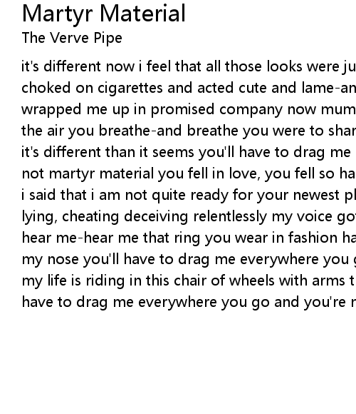 it's different now i feel that all those looks were just a game you smoked and choked on cigarettes and acted cute and lame-and lame your parting lips that wrapped me up in promised company now mumble that each breath i take takes from the air you breathe-and breathe you were to share these dreams but from this bed it's different than it seems you'll have to drag me everywhere you go and you're not martyr material you fell in love, you fell so hard you said it must be days i said that i am not quite ready for your newest phase-your face conceding, lying, cheating deceiving relentlessly my voice got softer you could no longer hear me-hear me that ring you wear in fashion has a chain that pierces through my nose you'll have to drag me everywhere you go and you're not martyr material my life is riding in this chair of wheels with arms that move too slow you'll have to drag me everywhere you go and you're not martyr material |