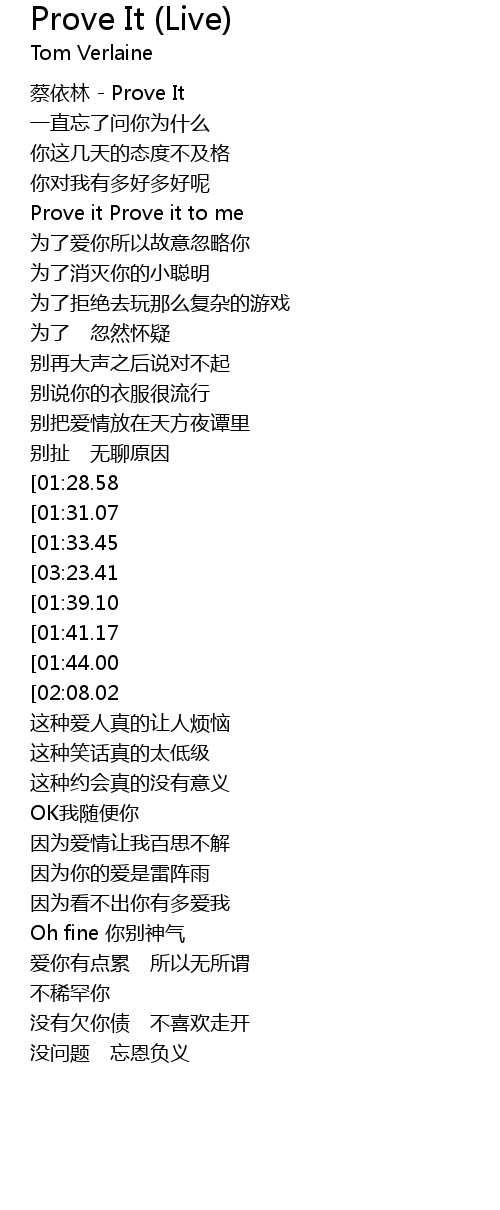 | [03:33.77][03:23.41][02:42.02][01:36.38][00:54.62] | Prove it Prove it to me |