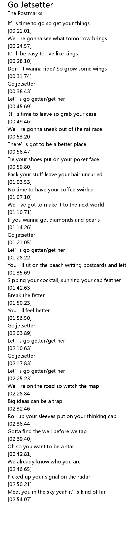 | [01:57.42] | Go jetsetter |
