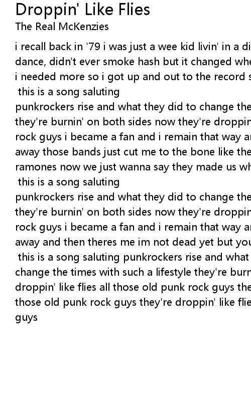 i recall back in '79 i was just a wee kid livin' in a dive didn't drink, didn't dance, didn't ever smoke hash but it changed when i heard the clash and you know i needed more so i got up and out to the record store i bought all the records i could afford an' i played em all on my stereo [Chorus:] this is a song saluting punkrockers rise and what they did to change the times but with such a lifestyle they're burnin' on both sides now they're droppin' like flies all those punk rock guys i became a fan and i remain that way and to this day, i'm still blown away those bands just cut me to the bone like the damned, the pistols & the ramones now we just wanna say they made us what we are today so every time we play we remember those of yesterday [Chorus:] this is a song saluting punkrockers rise and what they did to change the times with such a lifestyle they're burnin' on both sides now they're droppin' like flies all those punk rock guys i became a fan and i remain that way and to this day, i'm still blown away and then theres me im not dead yet but you never really know i could be next [Chorus:] this is a song saluting punkrockers rise and what they did to change the times with such a lifestyle they're burnin' on both sides now they're droppin' like flies all those old punk rock guys they're droppin' like flies all those old punk rock guys they're droppin' like flies all those old punk rock guys |